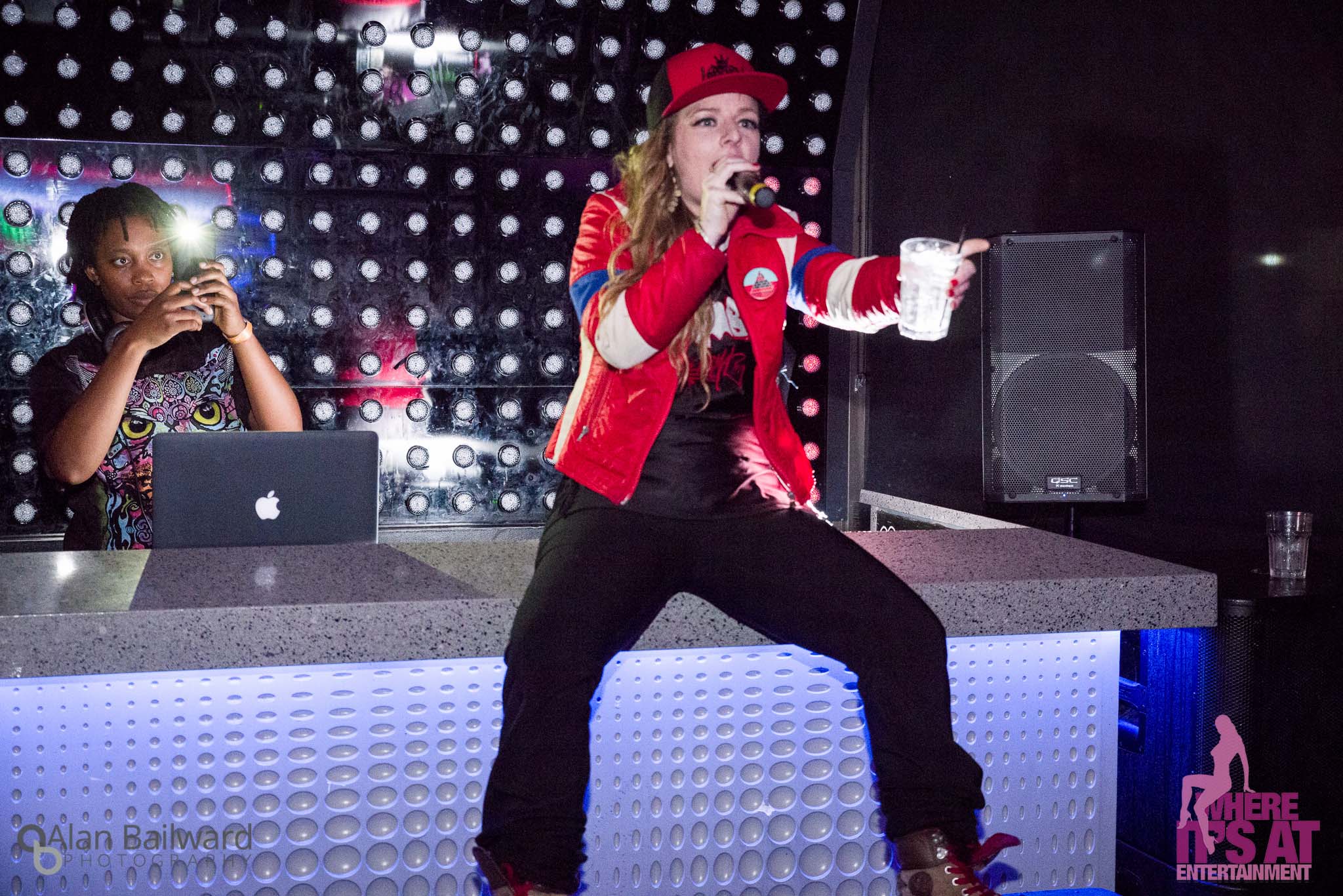 After DJ Denise’s set, the show started with some freestyle. Host Rasta Mike summoned the ladies to the stage for the cypher. They took turns freestyling solo and in pairs. Rapping about the theme that Rasta Mike threw out: Life. “Rap about life, just life”, he said. The club was extremely loud, and the sound was very hot, with the mic on the verge of feedback making it very difficult to hear the lyrics.
